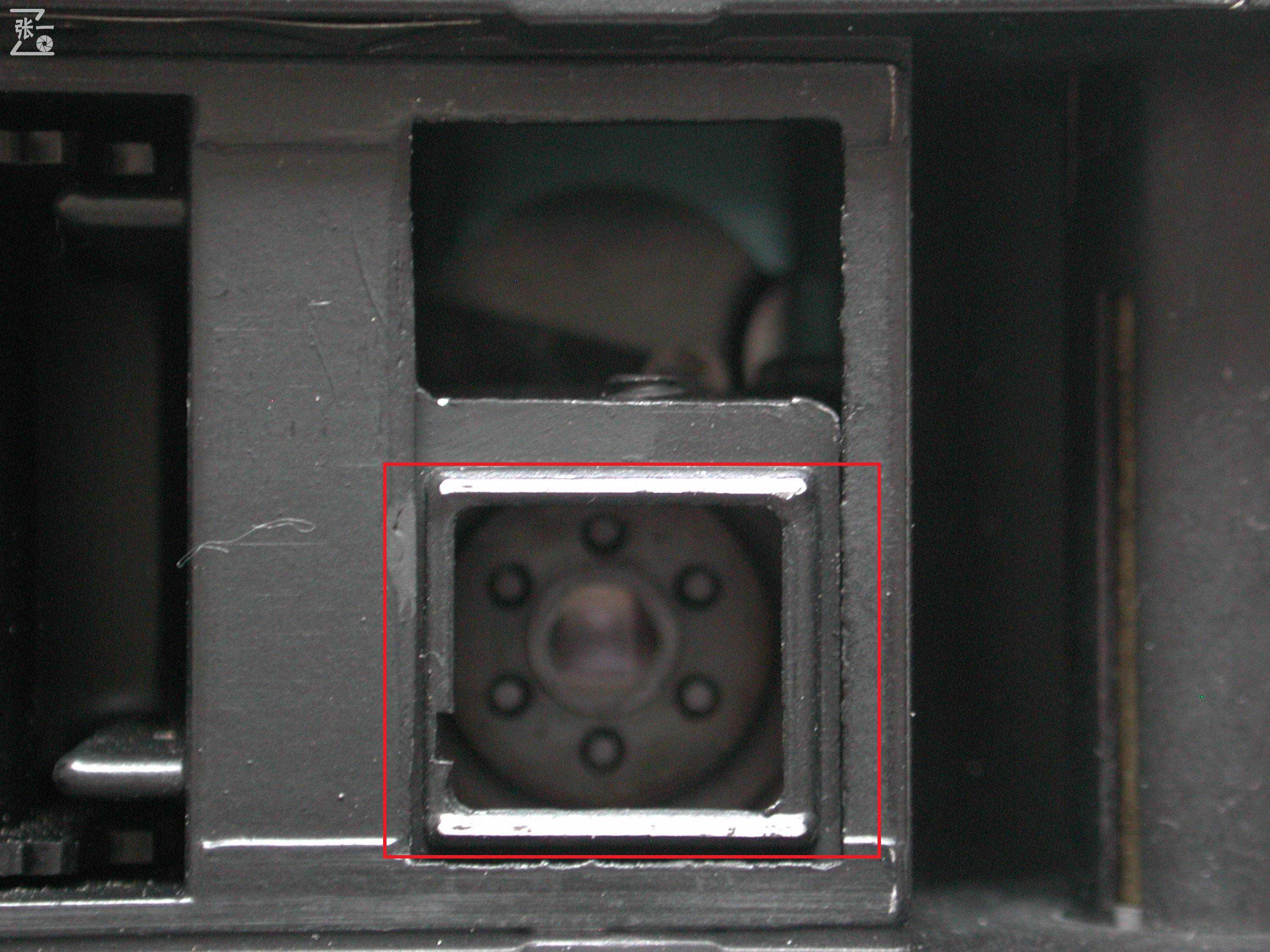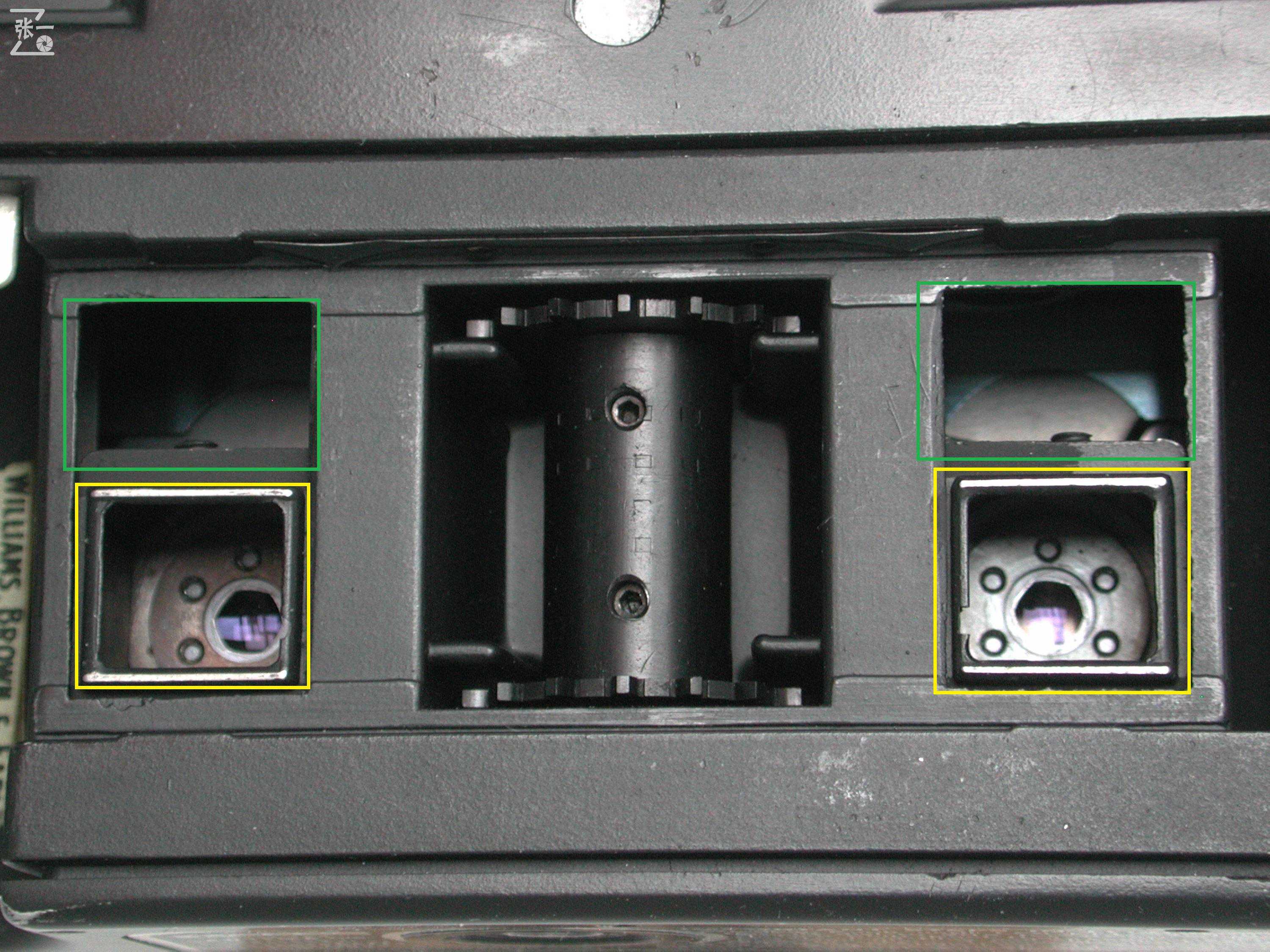 这个玄机打开片仓应该会看得更清楚一些:这款View-Master立体机的两侧镜头内部又被各自分成了两个小的正方块,如下图1中黄、绿框中对应的部分,其中黄框处的为该机的两个镜头。