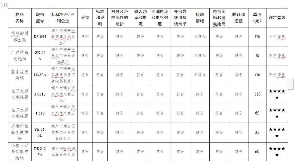 2.“精顺御用养生煲”“广兴精品电炖锅”“蓝水星电炖锅”的“接地措施”项目检测结果均不符合强制性国家标准,这3款样品不予评星。