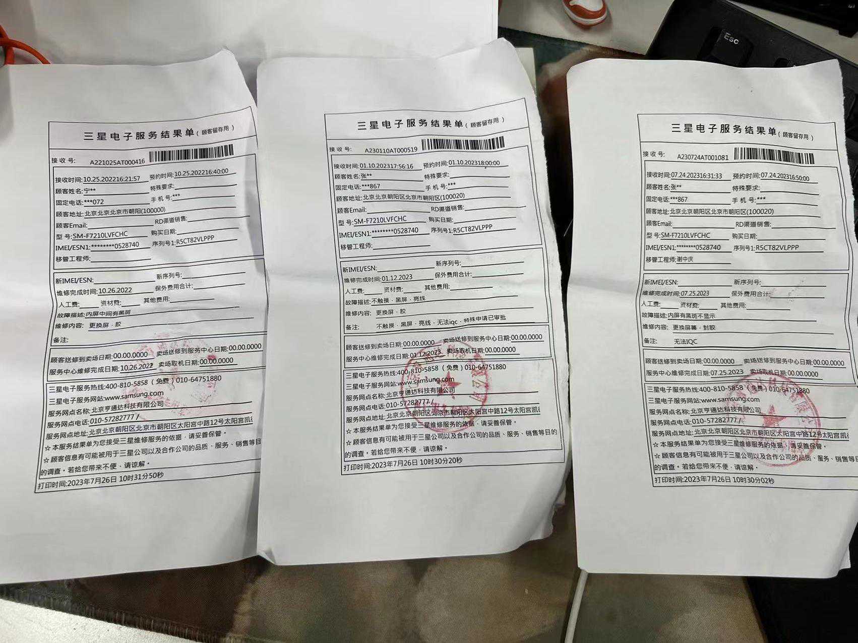 张先生介绍,2022年9月,他购买了一台SAMSUNGGalaxyZFlip4手机,手机使用不到1个月,中轴处的屏幕就开始漏液。于是他前往售后网点“北京亨通达科技有限公司”保内更换屏幕。新屏幕更换后过了3个月,手机再次开始漏液,他再次去该售后网点更换了屏幕。