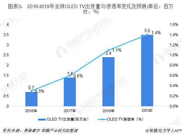下面我们来看看大尺寸OLED电视的情况,据奥维睿沃数据,2018年全球OLED电视出货240万台,同比增长69.4%,但全球OLEDTV渗透率仅为1.1%。