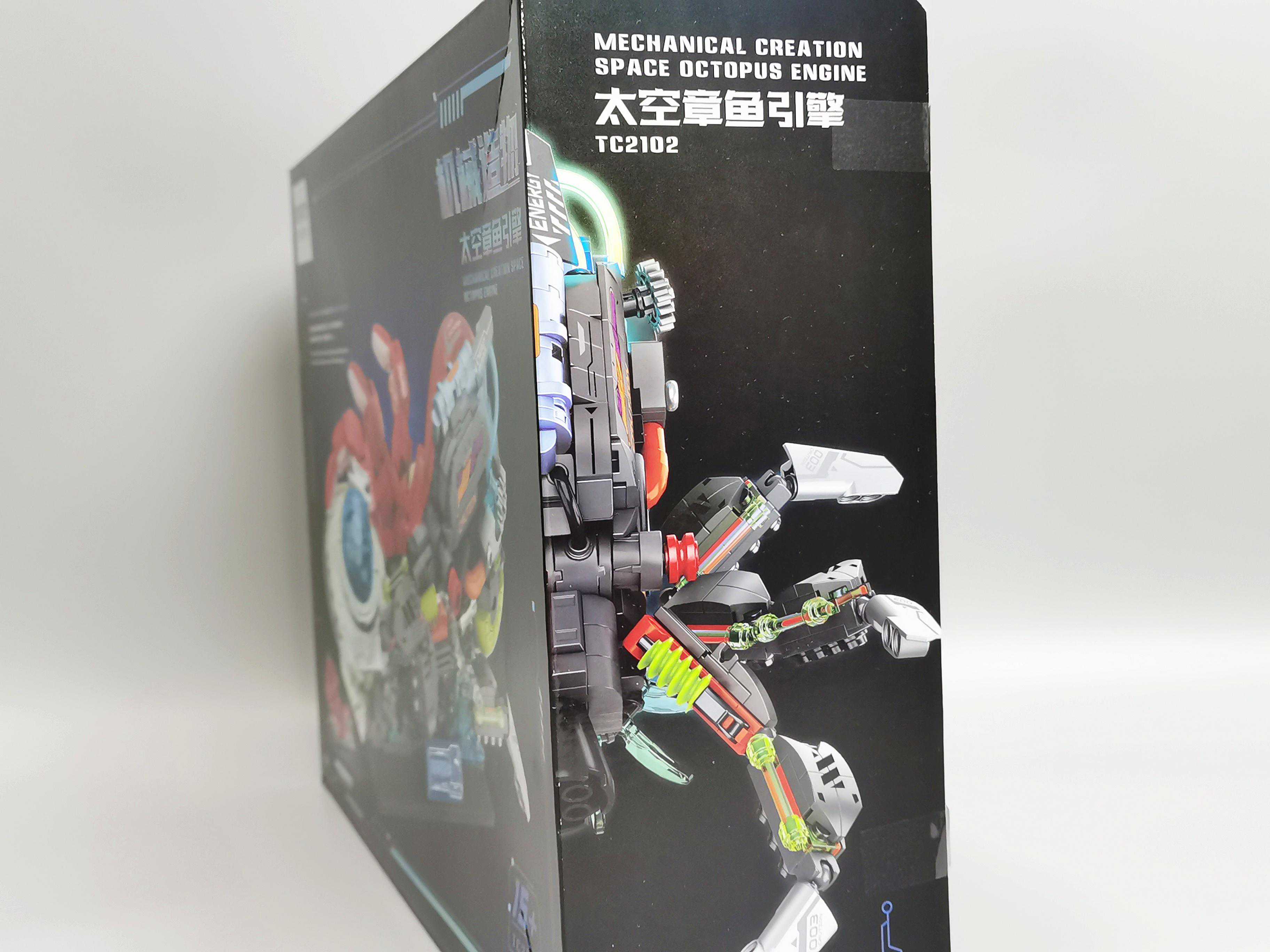 ▼盒子有镭射效果。在这个盒子正面,货号标注为TC2102,指导年龄15+,定位是成人收藏级。背面就是各种细节与玩法。两边的侧面居然是这个章鱼的机械端与生物端。