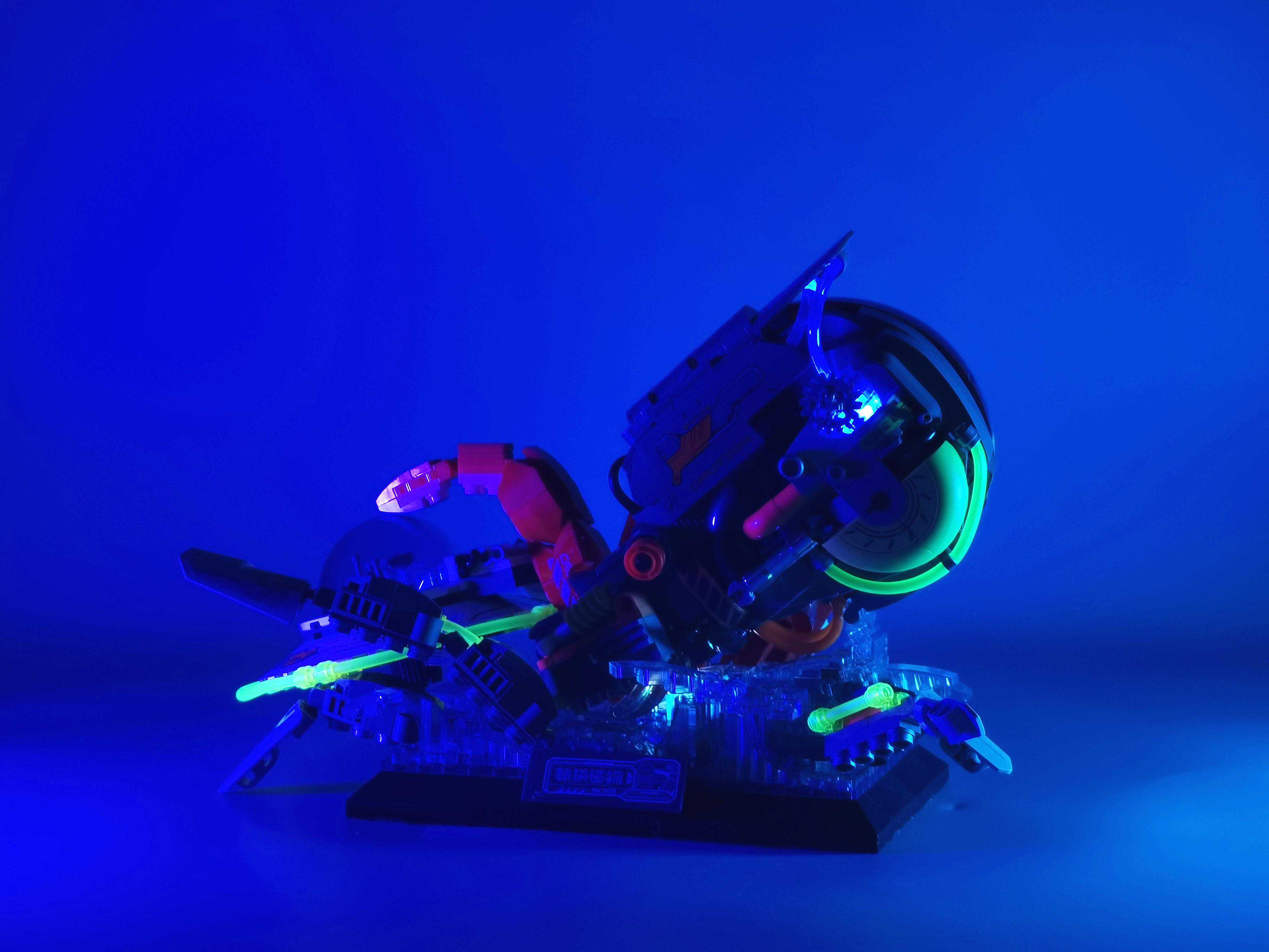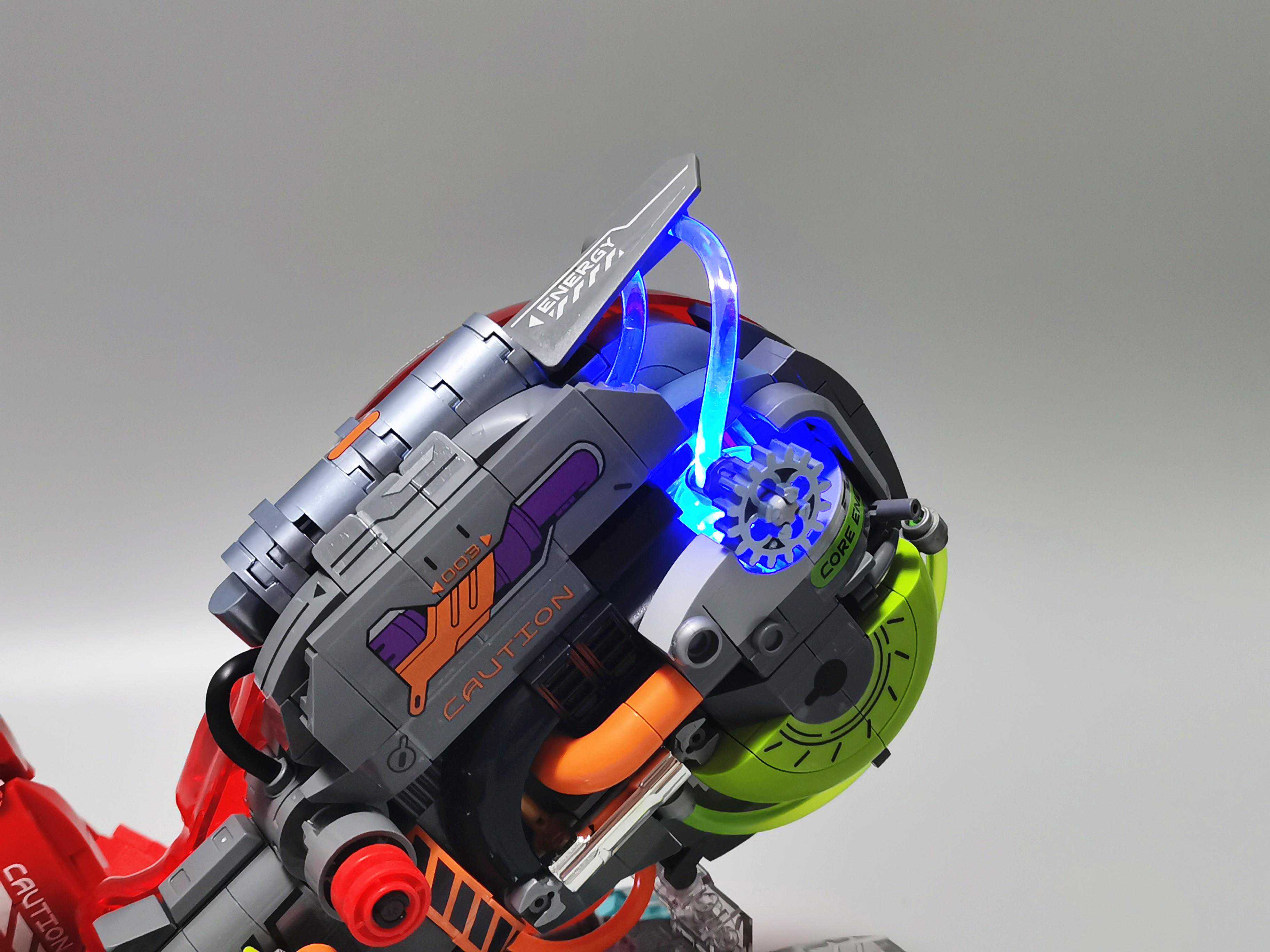 ▼章鱼有一半是机械结构,机油用蓝色灯光做了流动效果,问题在于这个粘好的零件角度是固定的,没法做到45度开关,所以会有一丢丢的接触不良的感觉。