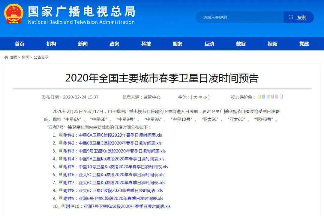 国家广播电视总局近日发布了2021年全国主要城市春季卫星“日凌”时间预告。预告指出,2021年2月25日至3月17日,用于我国广播电视节目传输的卫星将进入“日凌”期,届时卫星广播电视节目接收将受到“日凌”影响,并将“中星6A”“中星6B”“中星6C”“中星9号”“亚太5C”“亚太6C”“亚洲6号”“亚洲7号”等卫星在国内主要城市的“日凌”时间公布。