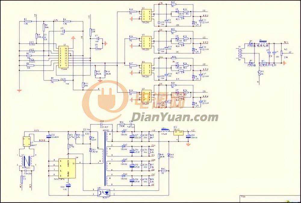 下面部分是辅助电源,AC220V输出经整流滤波送到TNY275控制芯片,这是一个单片反激式小功率开关电源,一共输出4路互相隔离的电源:一路为15V,经78L12稳压供给TL494,另三路为21V,分别送TLP250的输出端,为光藕内部的输出电路供电。