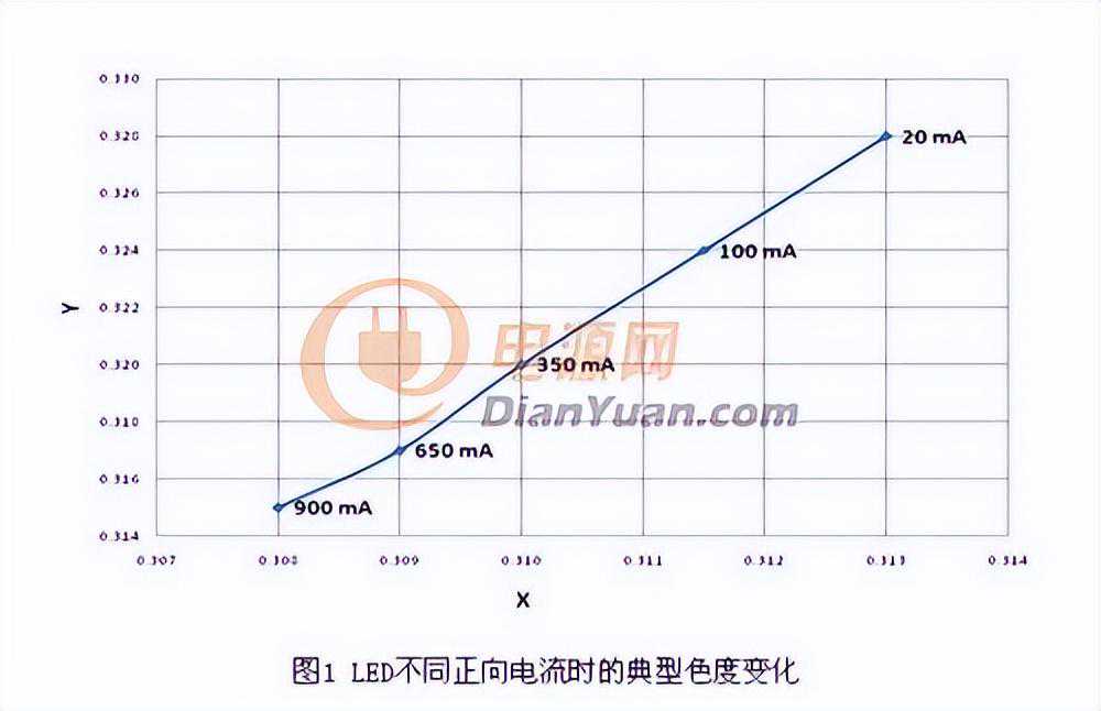 使用减小电流的方法进行LED调光类似于大多数白炽灯泡使用的调光方法。这种减小电流的方法在为数不多的应用中可以接受,但随着光等级降低,LED发出的光色彩也根据电流而变化。电流较小时,色度(Chromaticity)朝向黄色变化。图1显示不同电流时的典型色度变化。