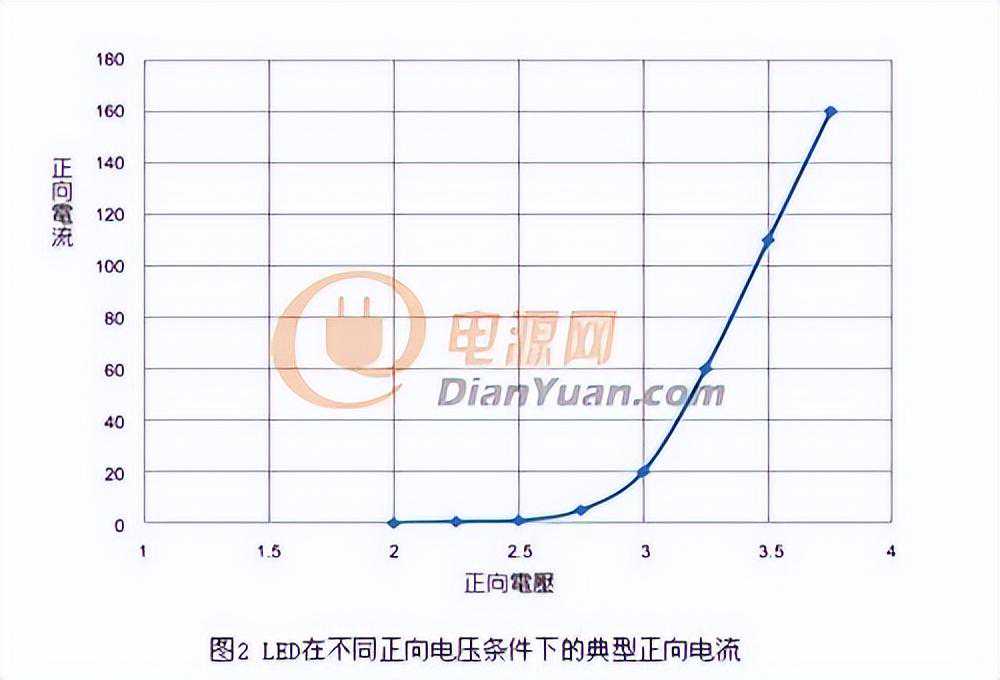 白炽灯泡的亮度能够藉减小电流的方法来调光至低于完整亮度的1%,因为白炽灯是藉由电流流过灯丝,使灯丝发热进而发光。但使用减小电流的方法,极难将LED亮度调至低于完整亮度的5%,因为所需的电压势会导致矽结点破裂并开始导电。LED是二极体,随着结点破裂,它就像是电子雪崩,电阻急速下降。要提供足够电压,使LED以极低电流导电非常困难。图2显示LED在不同正向电压(V)条件下的典型正向电流的曲线。