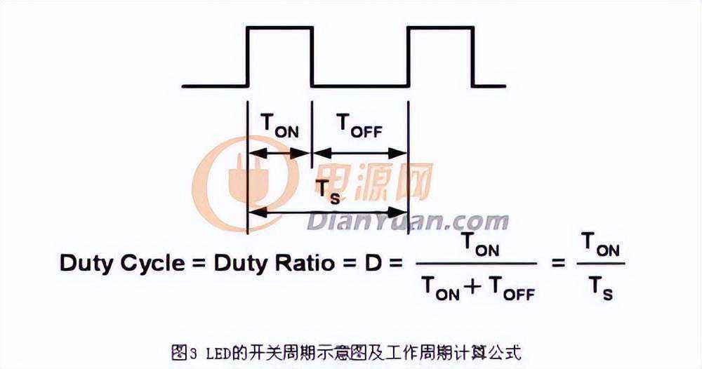 为LED提供脉波电流的方法也称作PWM,这种方法已经成为改变光等级的首选方法。LED本身是矽元件,对应流经它们的电流导通及关闭而快速地导通和关闭。开关时间在100奈秒(ns)等级,相当于最大频率10MHz。应用通常以100Hz~100kHz的频率工作。频率低于100Hz时,人眼会观察到LED光闪烁。频率在500Hz~20kHz之间时,电路可能产生能听到的杂讯。调光是通过在单个开关周期的某部分时间内将LED导通;而在此开关周期的其余部分时间内,将LED关闭来实现。这种导通关闭周期称作工作周期(D),其表达方式为LED导通时间(TON)除以整个开关/导通周期时间(TS)(图3)。