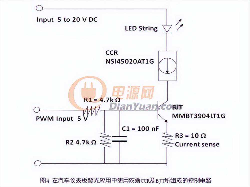 可以在LED的串列使用安森美半导体(OnSemiconductor)的双端CCR(如NSI45020AZT1G)及双极结晶体管(BJT)(如MMBT3904LT1G)来配置图4所示的简单电路,用于汽车仪表板背光。由两颗4.7kΩ电阻(R1,R2)构成的简单偏置电路置于双极结晶体管的基极。电阻值10Ω、精度1%的电阻(R3)置于双极结晶体管的射极脚,用来感测电流。测量电阻R3两端的电压即可简单地得出对应的电流(200毫伏特=20毫安培),R3仅用于测量电路电流,设计完成后即不需要它。电路的供电电压范围为直流5~20伏特。由微控制器(MCU)提供的5伏特控制电压,通过电阻R1施加在双极结晶体管的基极,并将双极结晶体管导通。CCR会自动地将流经LED的电流维持在20毫安培。