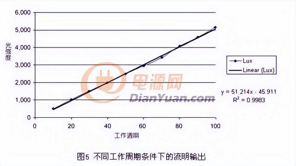 控制讯号的工作频率为300Hz,脉波宽度为30微秒(μs)。随着脉波宽度增加,LED导通的总时间也会延长,并提升光输出。在脉波接近零电平时,光输出也将接近零。图5显示不同工作周期条件下的流明输出曲线。