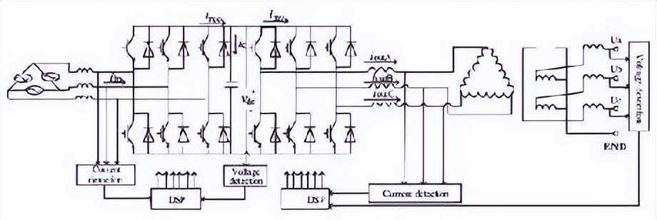 一个标准的基于DSP控制在线式UPS系统如图3所示。系统由推动型的前端整流器、直流链接、电压源逆变器构成。这两个功率转换器使用标准的空间矢量PWM控制,产生快速电压调节与总谐波失真最小化控制逆变器。
