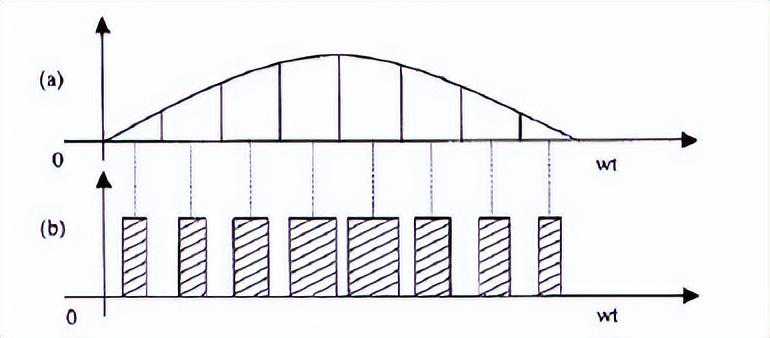 在采样控制理论中有一个重要的结论:冲量相等而形状不同的窄脉冲加在具有惯性的环节上时,其效果基本相同。冲量即指窄脉冲的面积。这里所说的效果基本相同,是指环节的输出响应波形基本相同。即当它们分别加在具有惯性的同一个环节上时,其输出响应基本相同。如果把各输出波形用傅立叶变换分析,则其低频段非常接近,仅在高频段略有差异。上述原理可以称之为面积等效原理,它是PWM控制技术的重要理论基础。