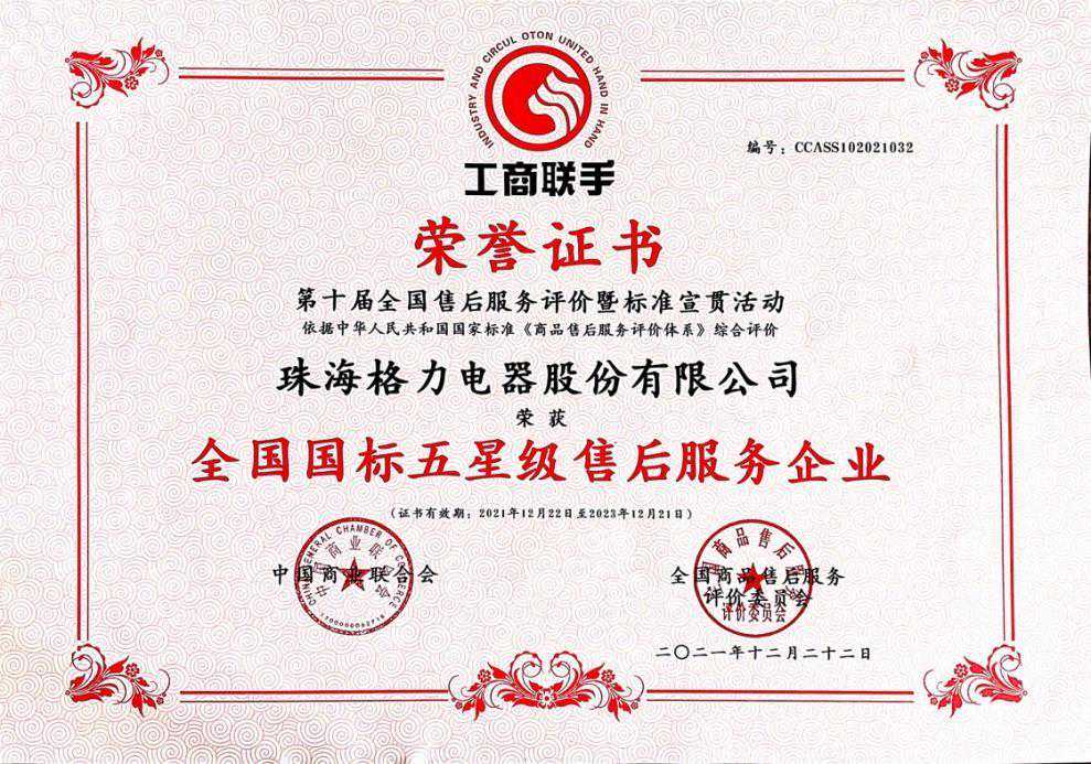 2021年12月22日,由中国商业联合会主办的“第十届全国售后服务评价暨标准宣贯活动”在海南博鳌举行。格力电器凭借完善的服务流程体系、高效专业的服务质量,荣获“全国国标五星级售后服务企业”、“全国售后服务TOP10”两大荣誉。