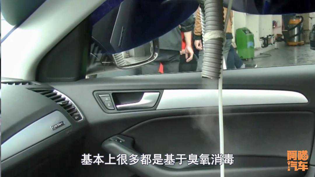 实际上首先做一下内饰的清洗,然后把空调系统的这个空调滤芯换一下,然后把风道里面灰尘给吹一吹。然后就来了个很重要的项目,就是空调的清洁保养消毒。实际上就是用了一台臭氧发动器,把车窗降下一点,然后再通过鼓风机,把产生的臭氧吹到车子里面去,然后再把车子处于怠速状态,把空调开启用内循环,让臭氧在车里面进行循环。尤其是让高浓度的臭氧,在空调系统里面跑一跑走一走。