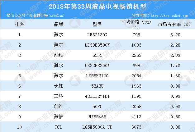 :2018年第33周全国彩电畅销机型排行榜已揭晓,据数据统计显示:第三十三周(2018年8月13日2018年8月19日)液晶电视畅销机型前十名分别是:海尔LE32A30G、海尔LE39B3500W、创维55F5、海尔LE32B3300W、海尔LS55H610G、长虹55A3U、三洋43CE1271D1、创维50F5、海信HZ55A65、TCLL65E5800A-UD。其中,海尔LE32A30G型号液晶电视以平均价795元每台位于畅销榜第一,市场占有率3.2%。