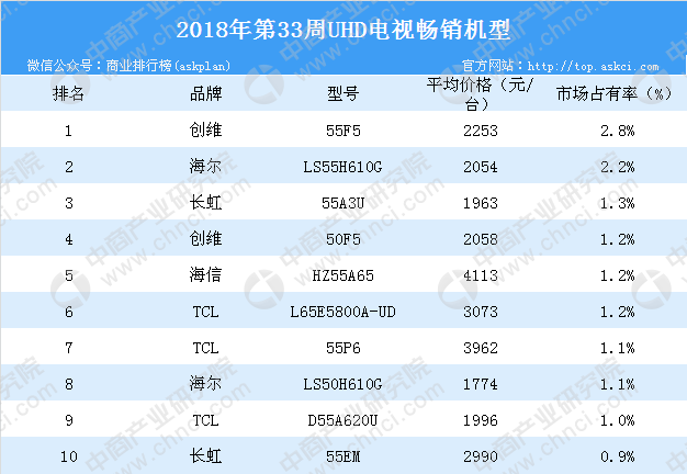 第三十三周(2018年8月13日2018年8月19日)UHD电视畅销机型前十的分别是:创维55F5、海尔LS55H610G、长虹55A3U、创维50F5、海信HZ55A65、TCLL65E5800A-UD、TCL55P6、海尔LS50H610G、TCLD55A620U、长虹55EM。
