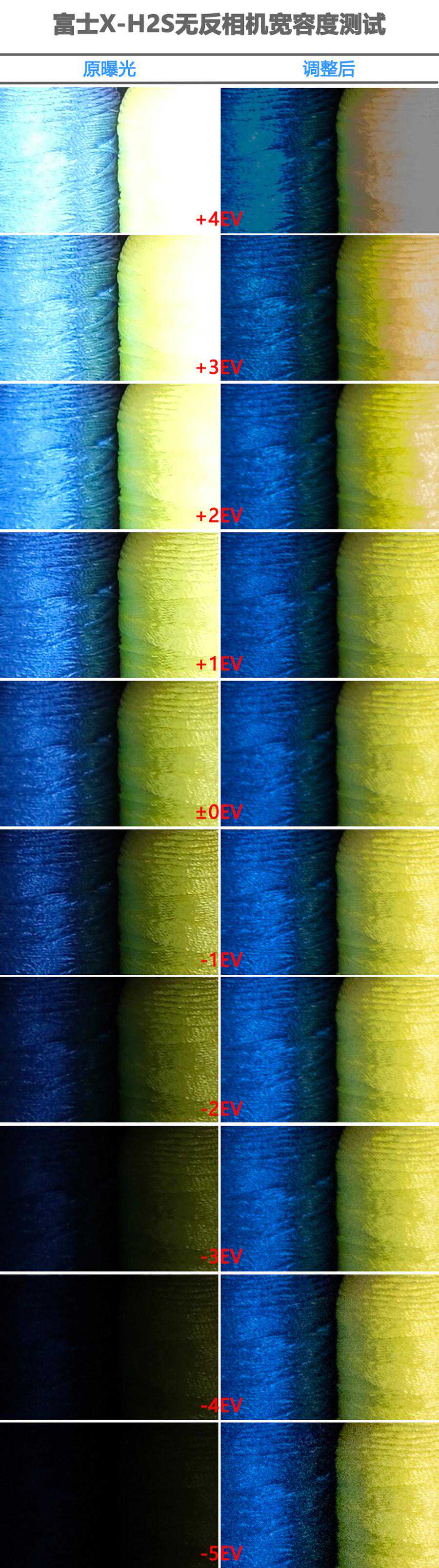 接下来,我们再来看看富士X-H2S在宽容度方面的表现如何。测试时我们为X-H2S设置为光圈为F8,ISO100,关闭相机所有校正及优化功能,使用RAW格式在+4EV、+3EV、+2EV、+1EV、0EV、-1EV、-2EV、-3EV、-4EV、-5EV曝光补偿下进行拍摄,并使用最新版AdobeCameraRaw软件将文件拉回至标准曝光(0EV,无降噪处理),RAW文件在拉回至标准曝光后转为JPG文件,并且截取100%放大局部进行对比。
