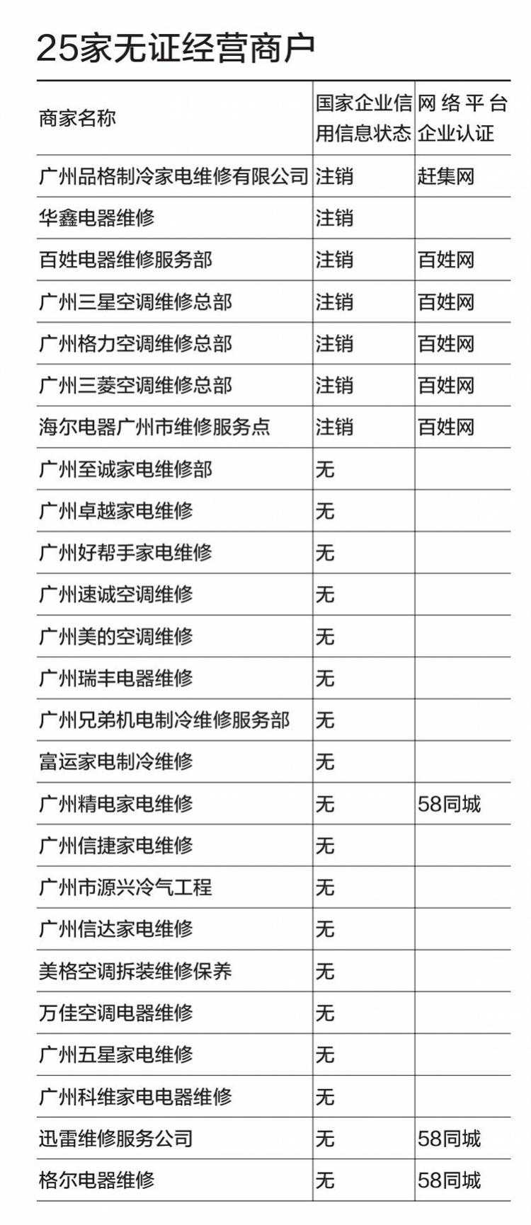 课题组发现,处于无证经营状态的25家空调维修商户之中,竟有9家商户获得百姓网(5家)、58同城(3家)或赶集网(1家)的企业认证,他们分别是广州精电家电维修公司、迅雷维修服务公司、格尔电器维修、广州品格制冷家电维修有限公司、天津市滨海新区百姓电器维修服务部、安徽新煌家电有限公司等。