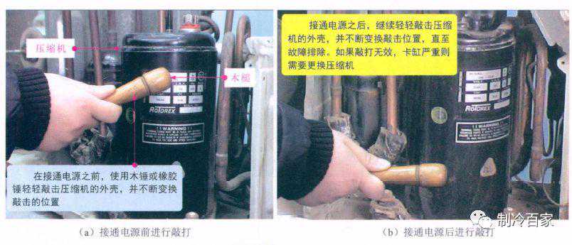 ⑦压缩机的外壳与管路之间的保温减震垫要符合一定的要求。若经检查发现压缩机出现卡缸或抱轴情况,严重时导致的堵转,可能会引起电流迅速增大而使电机烧毁。对于抱轴、轻微卡缸现象,可通过以下方法消除。下图所示为敲打压缩机
