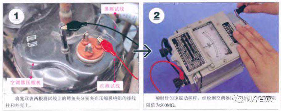 正常情况下,压缩机内电动机绕组与压缩机外壳之间的阻值应为无穷大(兆欧表指示500兆欧),若测得阻值较小,则说明压缩机内电动机绕组与外壳之间短路,应恢复绝缘性或直接更换压缩机。