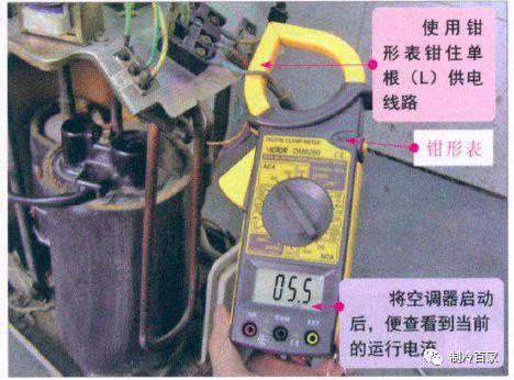 运行压力是通过三通检修表阀检测管路压力得到的;而运行电流可通过钳形表进行检测,如下图所示: