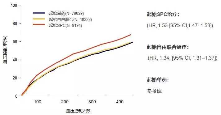 图1.与起始单药及起始自由联合相比,起始SPC显著提高患者血压达标率