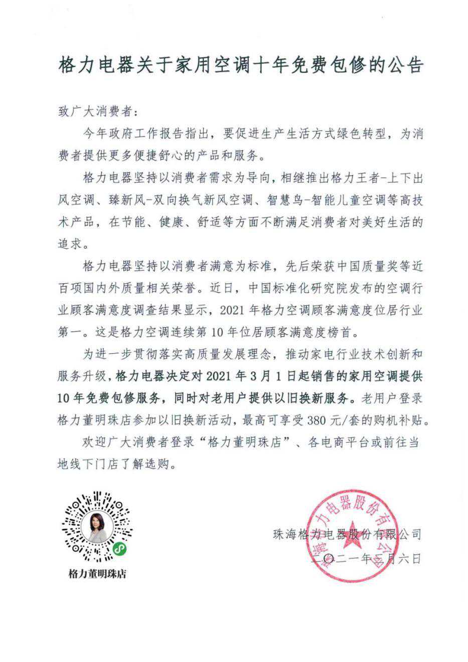 3月6日,格力电器发布公告,宣布对2021年3月1日起销售的家用空调实行“十年包修政策”,从更大程度上保障消费者利益。这是迄今为止中国家用空调行业承诺的最长包修期,也是自2005年格力率先在行业推出"家用空调6年免费包修"政策以来对服务品质的再升级。