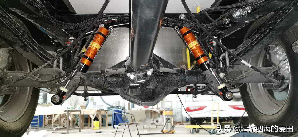 原厂前转向桥采用扭杆弹簧独立悬架,具备稳定可靠结构简单节省空间的特点,后驱动桥则采用钢板弹簧+液压筒非独立悬架,在此基础上改装厂在前后桥均加装了电控可调氮气减震系统,使得车辆操控性更好,侧支撑力更强,同时在极端情况下比空气悬挂稳定。制动方面,采用抗热衰退性更好的PowerPlus通风盘制动系统,后制动器采用行驻一体卡钳,具备驻车间隙自动调整功能,全系标配版本ABS刹车防抱死系统,配合EBD电子制动力分配系统,能避免在紧急刹车时车辆失控,令整车制动效率提升27%。TPMS主动胎压预警系统对轮胎压力、温度实施主动监控。