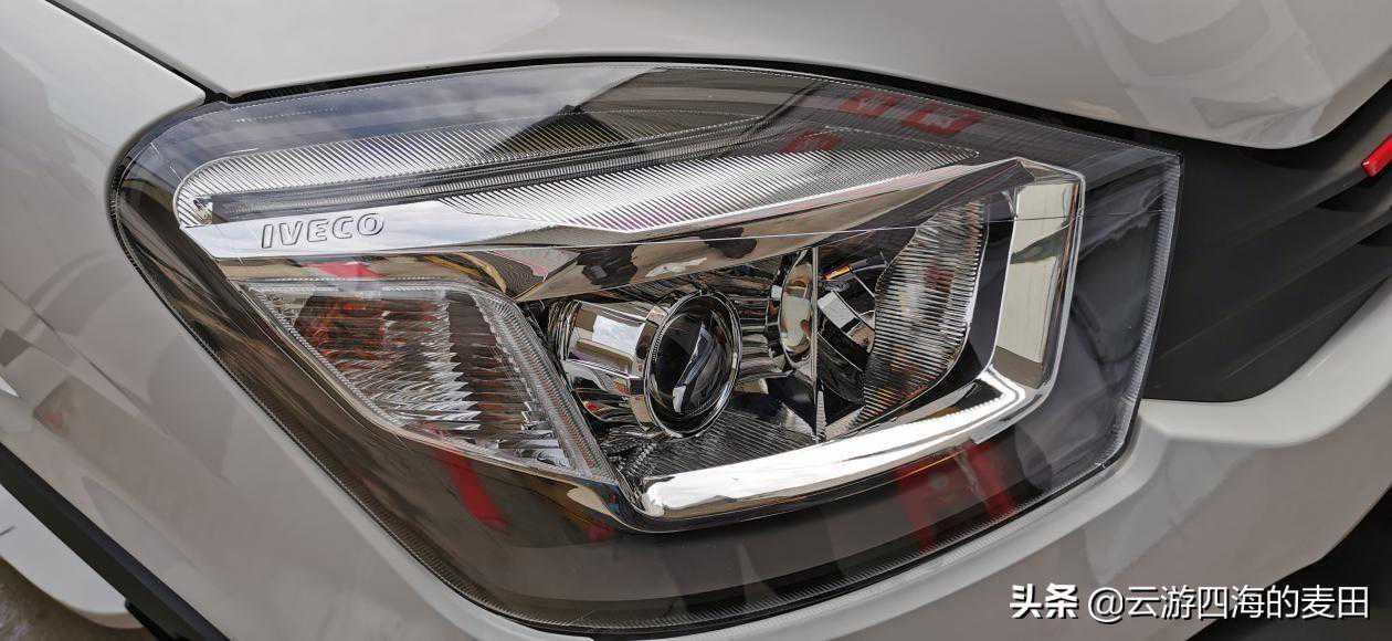 前脸采用U型硬汉流线造型,前进气格栅采用了时下流行的上下分体结构,其上半部分格栅带有三条红色装饰条两侧略微上扬,与大灯组融为一体,下半部分格栅采用倒梯形设计,中间IVECO的镀铬标志因前脸的凸出十分显眼。独立式双倍光导照明前大灯,配以双曲面宽视野后视镜,具有很强的视觉冲击力。保险杠上还设计了低位防滑踏板,方便驾驶员对车辆前部清洁。小额头的设计既降低风阻减少油耗,又能提高通过性以及整车外观美观性。