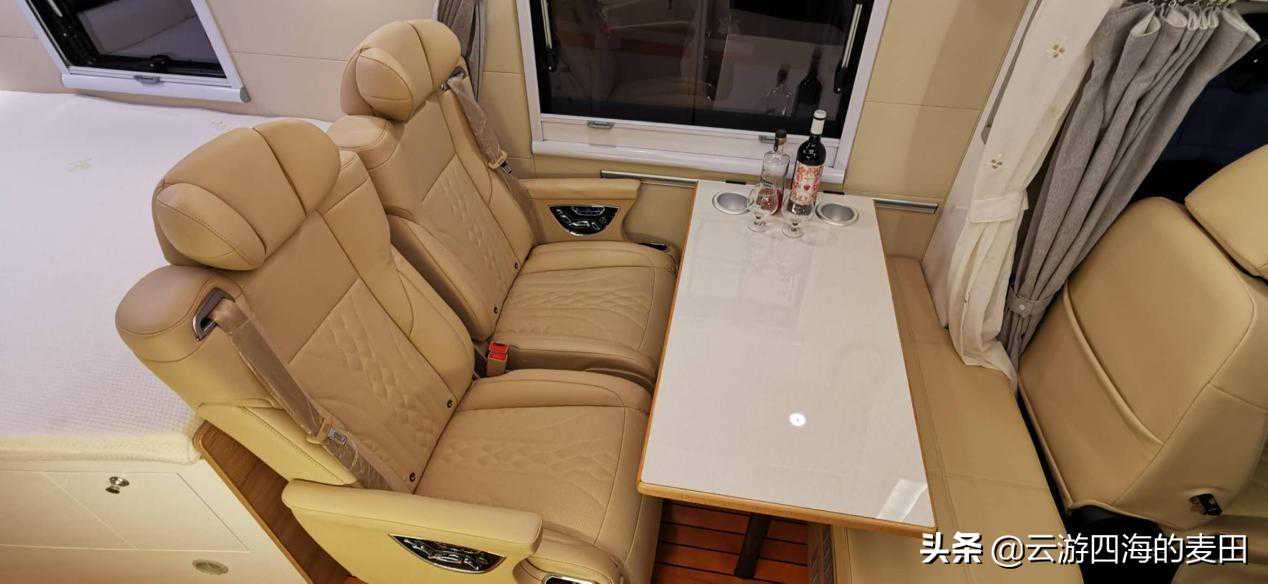航空座椅并未配备脚托,主驾驶后方设置了一个类似长条凳的设施,既可充当脚托也可以座在那里,形成一个四人会客区,主驾驶空间受限并不具备旋转功能。桌子上的两个杯架,可在行驶途中固定水杯饮料又或者是酒杯。航空座椅配有预紧限力三点式安全带,满足法规核载人数要求,同时保障乘客生命安全。