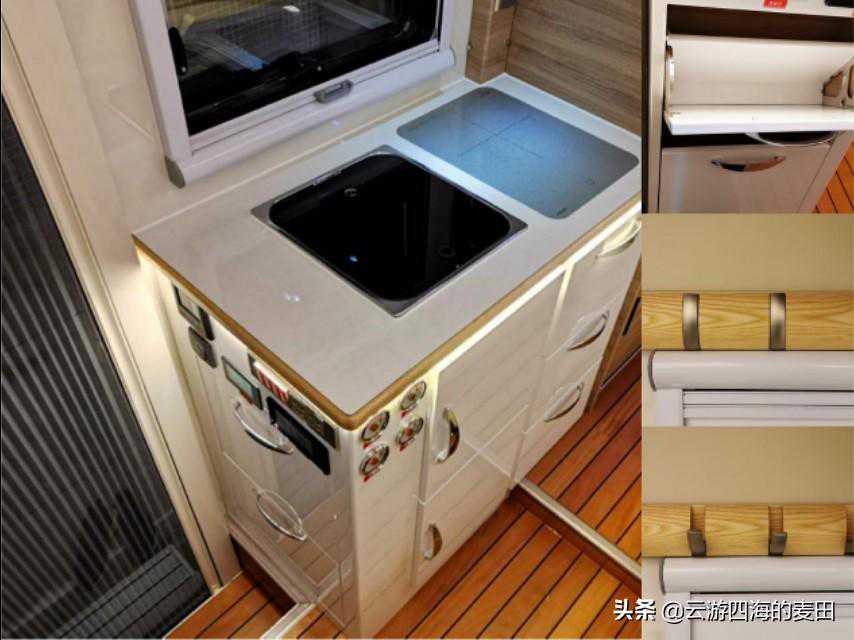 厨房区域配有一个意大利进口CAN带翻盖的洗菜盆、单眼电磁炉、抽油烟机等基础设施。左侧上部分是乘客门拓乐电动踏步开关、发电机控制面板、五孔插座以及其他设备控制开关,下方两个格子则是鞋柜带锁止机构,一家人的鞋子完全满足,不过笔者建议在这里放拖鞋。正面下方则有主副水箱、灰水箱、黑水箱的容量计,五个分区的带锁止储物柜,可以存放一家子的餐具以及烹饪所需的锅碗瓢盆。窗户上方的四个可折叠隐藏挂钩可以挂一些平时擦桌子的抹布,图中为乘客门内防蚊门开启状态。