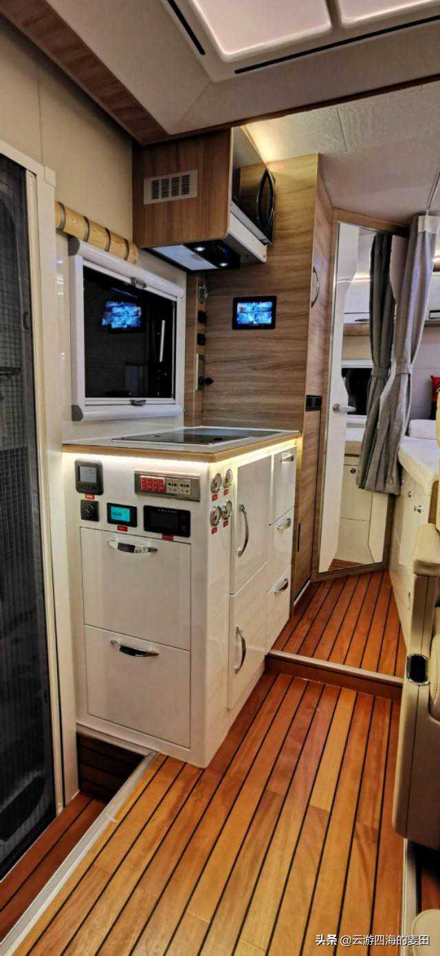 转角处设有两个五孔插座以及USB12V接口,方便煮水壶、豆浆机、面包机等设备插电使用。上方则是电动吊床的控制装置,为确保意外的发生,启动电动吊床需先插入钥匙,有效防止儿童误触发生意外,旁边则是远程四路监控车内显示屏。电路方面该车配有12V1000AH磷酸铁锂电池组,3000w工频充逆变一体机,150A+150A双行车发电机,3000w虹晟达车载底挂汽油变频静音发电机机组,500w汉能薄膜太阳能板(含MPPT控制器)。