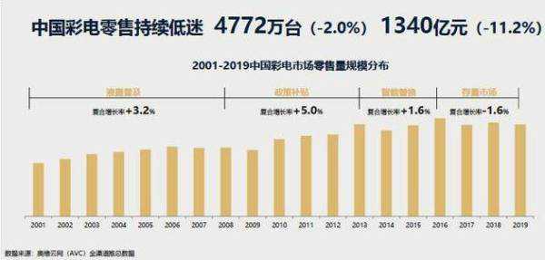 目前,国内电视市场的竞争日趋激烈。根据奥维云网发布的《2019中国彩电市场总结报告》,2019年彩电市场全年零售量4772万台,同比下降2.0%;零售额1340亿元,同比下降11.2%。