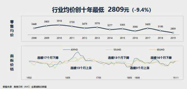行业均价也在不断下行,2019年彩电均价2809元,同比跌9.4%,创十年最低。