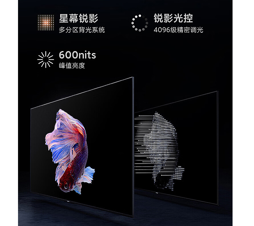屏幕逐台调校,ΔE≈2,支持AI远场语音,双频WiFi,混合调光,采用,体验流畅。总功率110W。