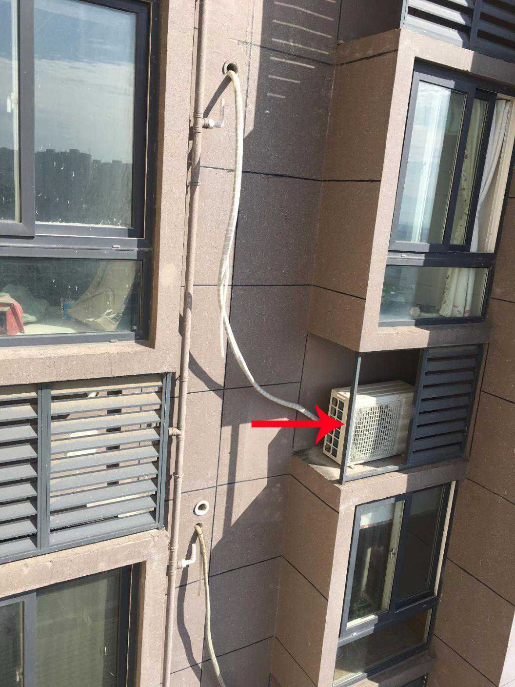 这个空调外机位相信很多人都挺熟悉的,竟然在两户人家墙壁夹缝之间,距离阳台很远,旁边的窗户又打不开,师傅们也只能望机兴叹了。