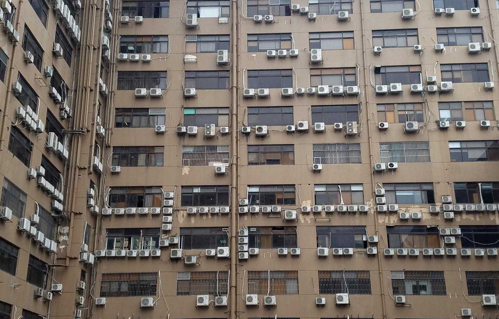 整栋大楼都没有空调外机位,空调全都直接挂在外墙上,看上去密密麻麻的,名副其实的最牛空调楼呢!