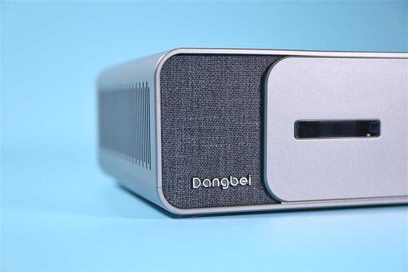 当贝投影F1C裸露在外的壳体部分也是选材于深灰色的工艺麻布料,还有一部分则是星空灰色的ABS板材,两者共同拼接在一起而成一体,色调上十分和谐,兼顾锐利的科技感与柔和的家居风。