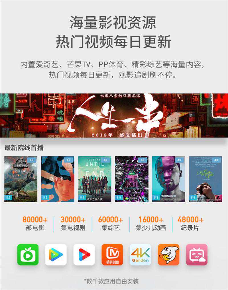 当贝起家的当贝市场以及影视快搜等高频电视应用也被无缝整合进了当贝OS系统之中,成为了其中的重要组成部分,为当贝投影F1C带来了可能是全网内容最全的地位和存在,其内置爱奇艺、芒果TV、PP体育等大量内容平台,从官方所宣称的80000+电影、30000+电视剧、60000+综艺、16000+少儿、48000+纪录片的强大内容库存量也可见一斑。