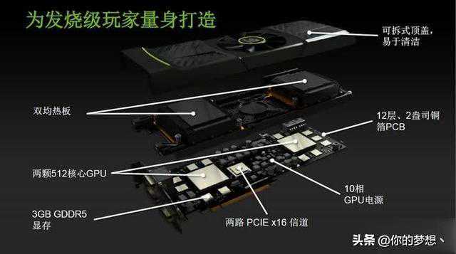 每一代显卡的单GPU最高性能灰常有限,所以想要在短时间内打造更强的显卡,就需要GPU互联技术,随后基于多卡互联的单卡产品也纷至沓来,自此以后最强性能产品当属每代的双芯显卡。不过英伟达在进入费米架构后,强大的费米架构衍生产品在带来了强力性能的同时也带来了一些隐忧,造成在第一代费米架构产品的双芯造星计划破灭。随后推出的优化后的GF104等核心却是缩减了对3D游戏影响比较少的双精度,换取了功耗、温度及频率上的优势,但是这类核心并不能组建双芯产品来撼动HD5970,更不用说HD6990的大哥地位。