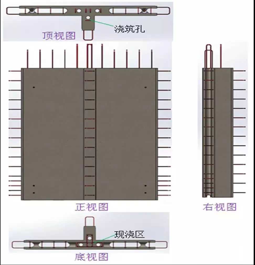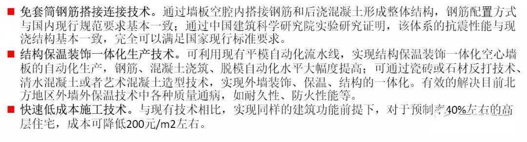 优点:上下层剪力墙现浇连接,内外墙板与内芯整体受力;预制部分代替了部分模板,可全自动化生产。