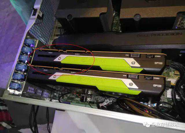 NVIDIA资深工程师也来到现场,演示2片QuadroGP100顶级专业显卡/GPGPU的AI加速渲染能力。上图中的红圈部分,是用于多卡互连的NVLINK高速接口。