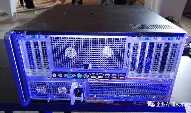从这个角度,隐约可以看到机箱后部的2个排气风扇,上一代Precision工作站是没有的,这点变化的意义我在后面还会解释。另外,可直接抽拉更换的电源现在位于一个角上,剩下我用红色圈出的位置,也可换成4个3.5英寸热插拔硬盘位。