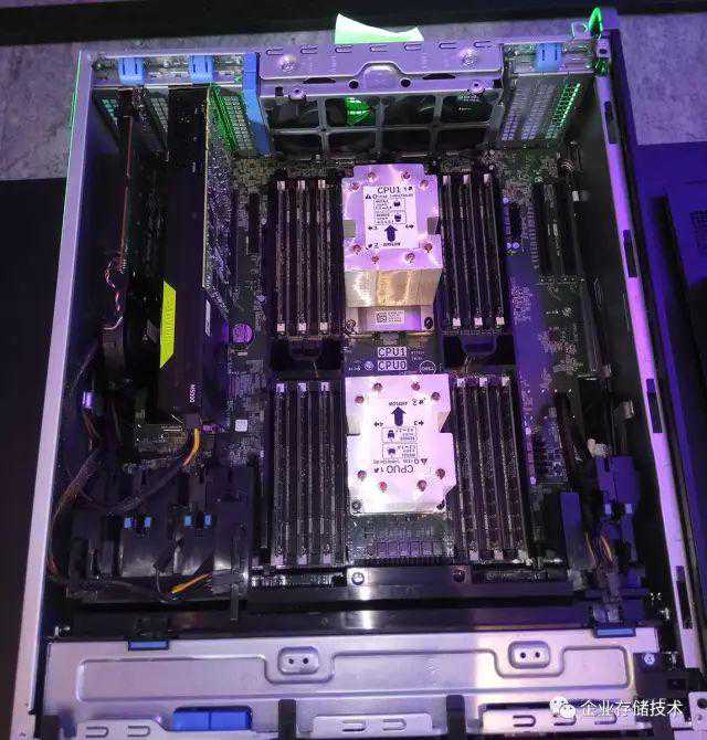 拆下导风罩之后,可以看到7920两颗CPU的被动散热器(真的是被动?)和内存。记得我在《四路XeonSP服务器内存减半:Intel葫芦里卖的什么药?》里写过每颗XeonSP内存控制器最大支持6通道12个内存插槽,7920Tower工作站就是按满规格做的,如果搭配单条128GB的LR-DIMM内存,最大容量可以配到3TB。