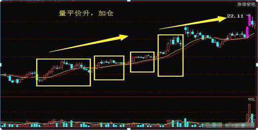 当股价经过一轮涨升时,获利盘涌出,使股价继续上升受阻,需先经过一段蓄势调整才能继续上升,此时成交量逐步萎缩到一个较低的位置,股价也小幅下跌至一个相对低点,这时应是明确的买入时机。当成交量重新开始放大,将展开又一浪升势。