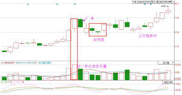 如上图,我们发现在上行的过程中该股出现了天量上涨的现象。在这样的情况下很多投资者会认为天量出现,同时之后又连续几天的小阴是庄家在出货的表现,而卖掉手中的股票。其实不然,按照我们的方法,观察天量之后的股价变化我们可以看到上图中不是那么明显的启明星形态。同时在天量后的回调中股价并未出现大幅阴跌而是小幅的回调。在此时我们可以选择“启明星”形态出现时入场,也可以在天量后的最近一个收阳处入场。但是这一方法一定要待天量后观察,忌讳天量当天入场。