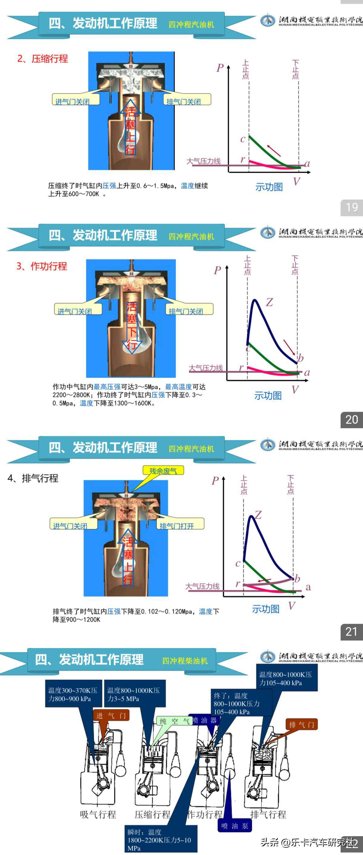 汽车发动机工作主要有四个行程,分别为:进气、压缩、作功、排气