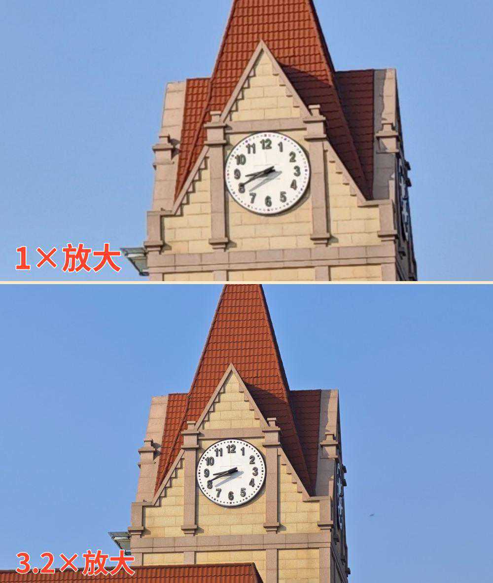 接着切换到3.2×变焦,同样输出了一张1200万像素的照片,并且画面也十分清晰,对比1×模式放大后的观感,不仅钟表上数字更加清晰,墙砖上的细节也更加丰富,和光学变焦镜头拍出的照片几乎没什么差别。