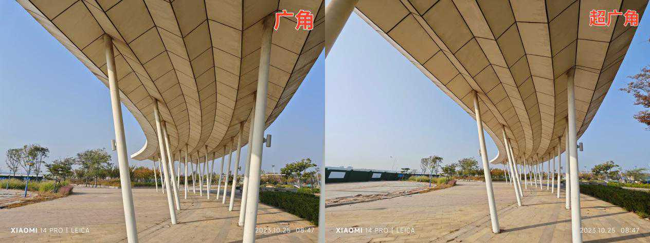 小米14Pro还搭载了一枚1200万像素的超广角镜头,在下面这组广角和超广角对比的照片中可以看到,超广角模式下画面的整体风格和广角模式并没有明显的差异,同时超广角镜头获得的视野确实明显更大,而画面整体也没有因超广角而出现畸变,效果出色。