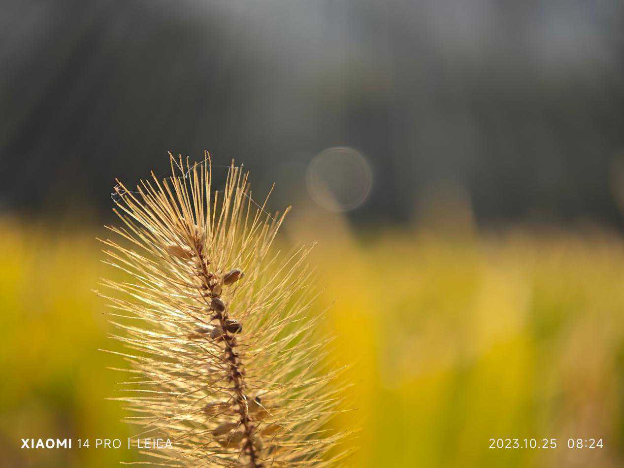 此外,小米14Pro还支持超级微距拍摄,比如下面这张照片,以非常近的距离拍摄路边的狗尾巴草,照样能对上焦,而且狗尾巴草是在风中摇晃的,小米14Pro抓拍得很准,草上的种子和毛须非常清晰,同时背景的虚化也十分漂亮,完全是奶油一样化开的。