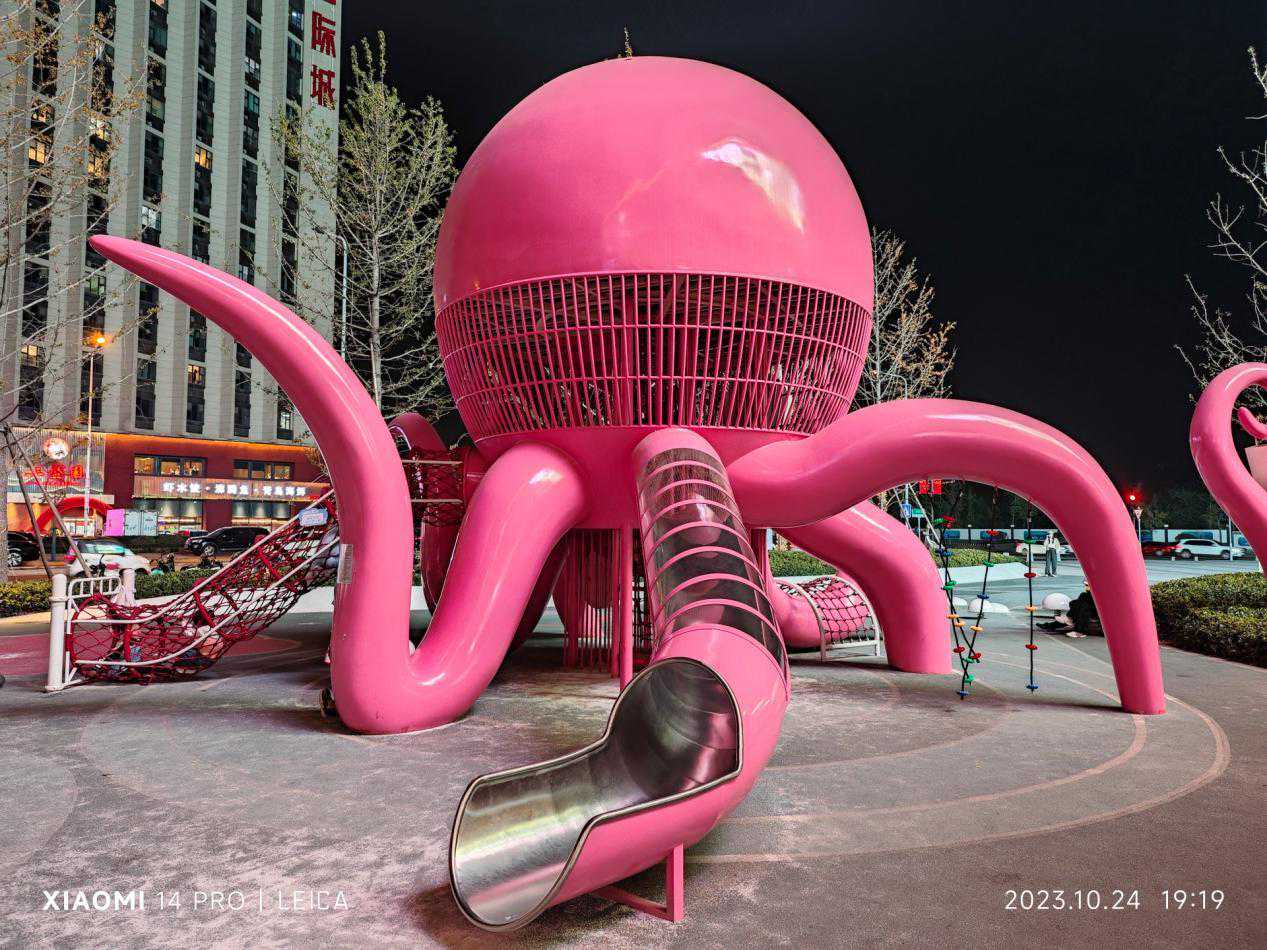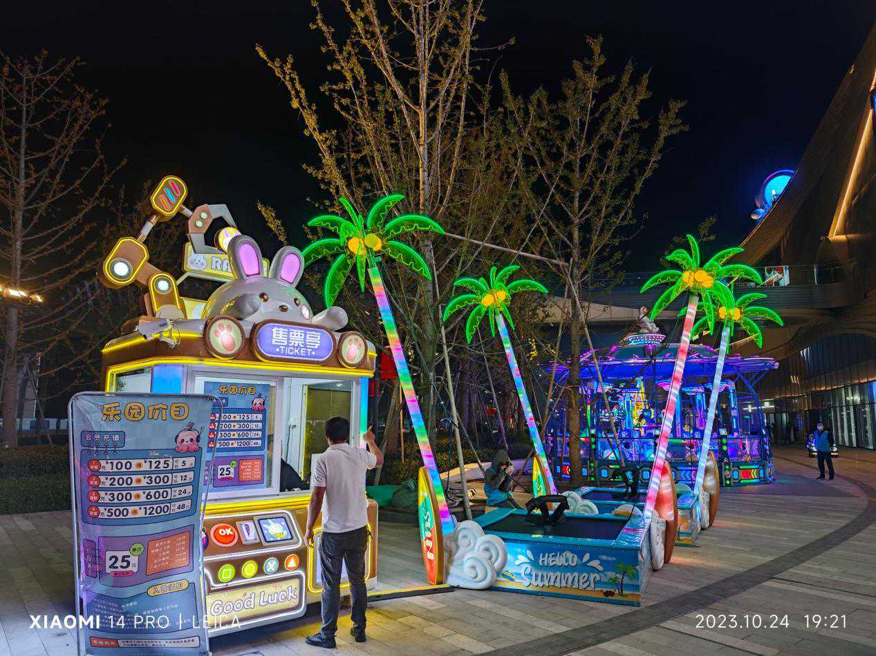 下面这个场景中,光线比较复杂,既有游乐设施缤纷的灯光,又有路灯以及周围商场霓虹灯的照射,而小米14Pro的照片中不仅呈现了出色的动态范围,白平衡的控制也是很出彩的,男子白色的短袖、娱乐设施上白色的云朵,都没有受到复杂光线的影响而发生色偏。